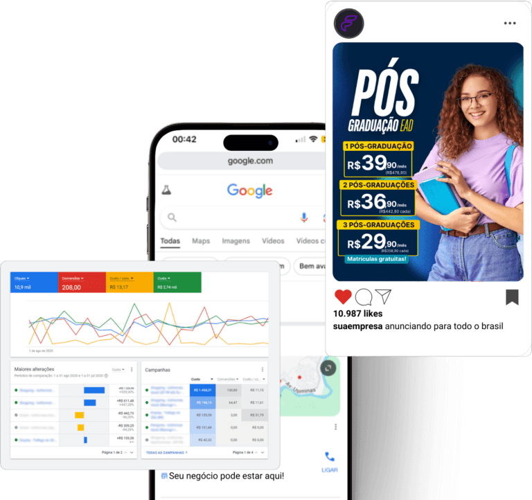 Com anúncios estratégicos no Google Ads, Facebook Ads, Instagram Ads e outras plataformas, atraímos pessoas realmente interessadas no seu produto ou serviço e transformamos cliques em vendas.